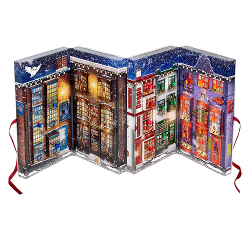 Open this enchanted advent calendar to discover four of the shop fronts from Harry Potter's Diagon Alley. In these magical shops they sold wands, pens, books, and quidditch supplies.